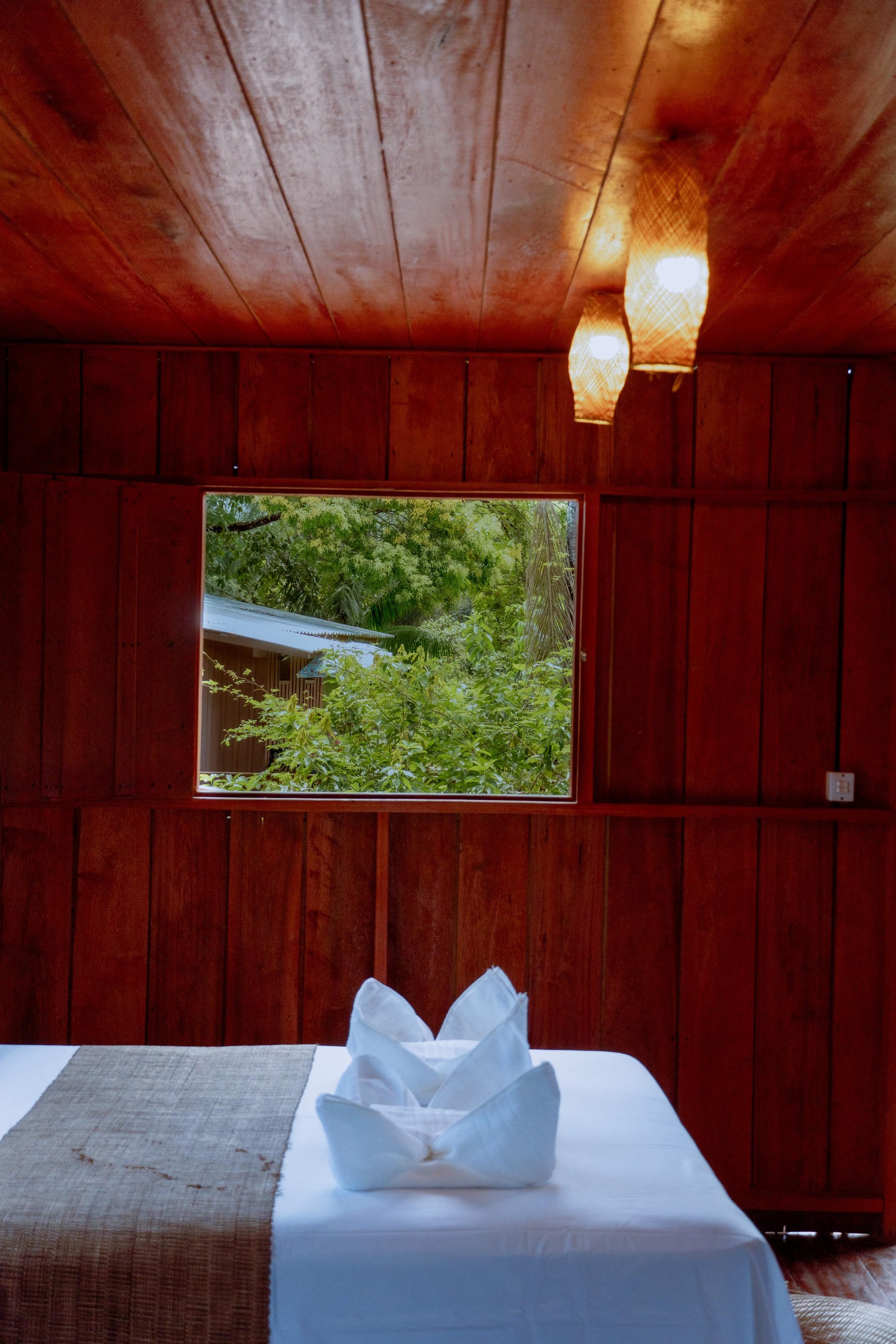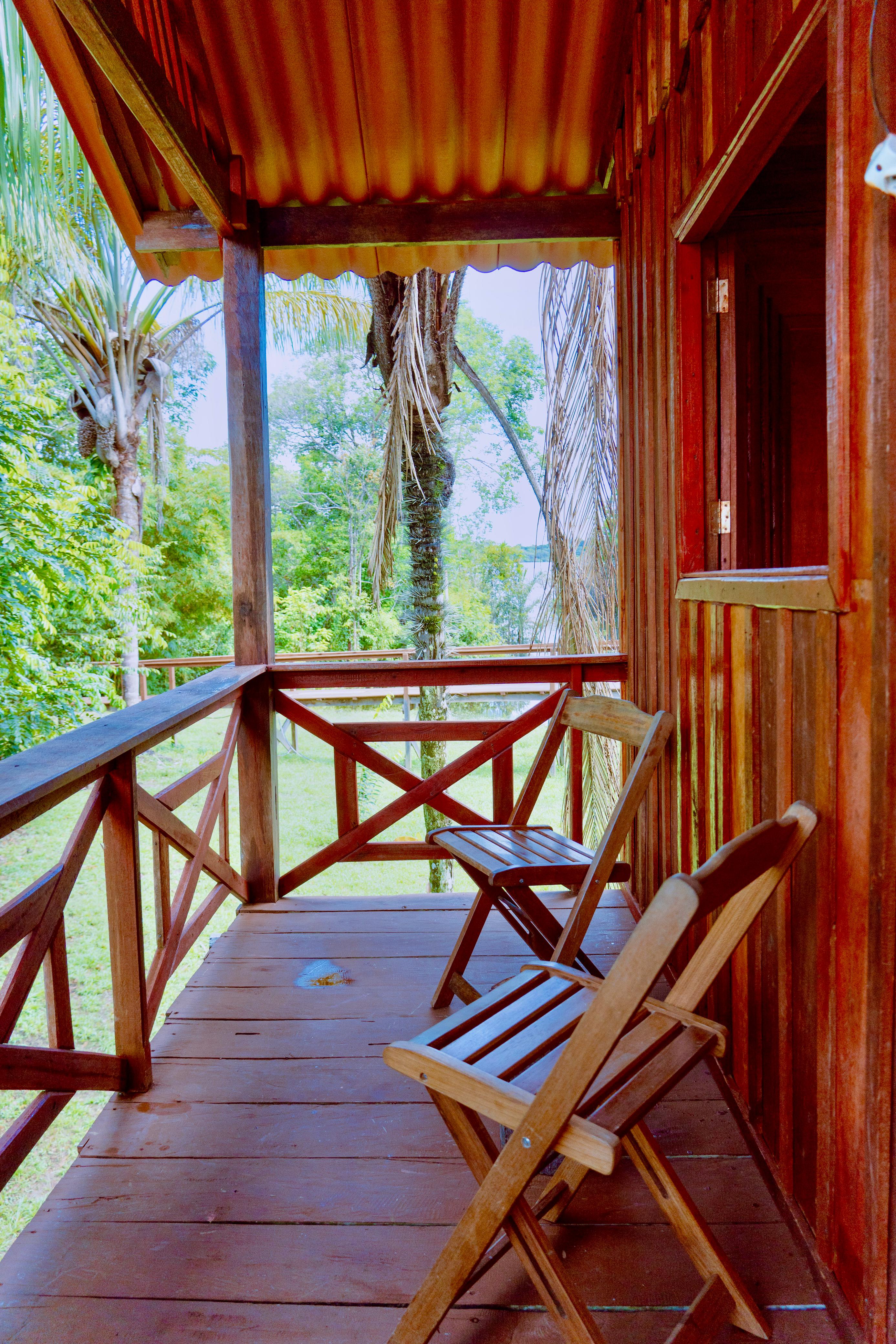 A varanda proporciona uma vista deslumbrante da floresta, criando um local ideal para relaxamento e imersão na natureza.